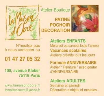 Nouvellement implanté dans notre arrondissement, La Maison d'Ocre, 100, avenue Kléber, boutique de décoration, propose également des ateliers pour adultes et pour enfants, atelier patine, peinture au pochoir, sur tissus, etc... Si vous êtes intéressez vous trouverez le détail de ces ateliers et les tarifs de ceux-ci en cliquant ici.
