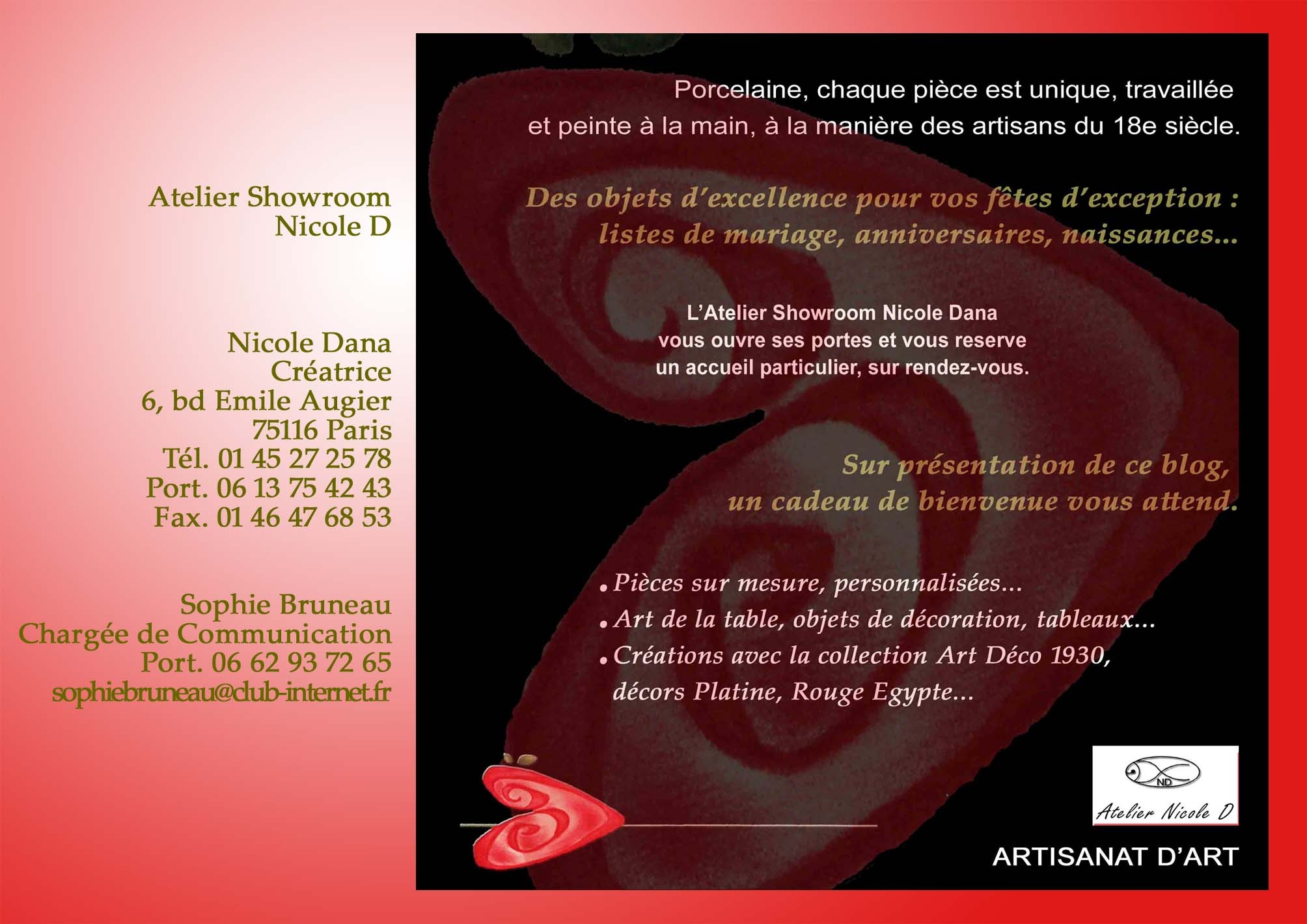 Nicole Dana, artiste céramiste et créatrice vous ouvre les portes de son showroom, 6, boulevard Emile Augier et si vous vous recommandez de Paris16info vous pourrez bénéficier d'un cadeau de bienvenue. (Pour plus de détail cliquez sur l'illustration).