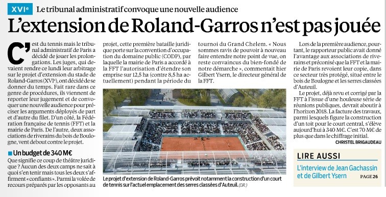 Dans le Parisien d'aujourd'hui à lire une intéressante interview de Jean Gachassin, Président de la FFT, et surtout un article qui nuance l'enthousiasme et la confiance que ce dernier quand à l'extension du complexe sportif sur les Serres d'Auteuil. En effet, le tribunal administratif pourrait bien revenir sur la convention d'occupation, sans parler du coût du projet qui a été très largement sous estimé... et ce n'est qu'un début, de nombreux autres recours devraient être soulevés. En somme, pour la FFT, le match est loin d'être gagner.