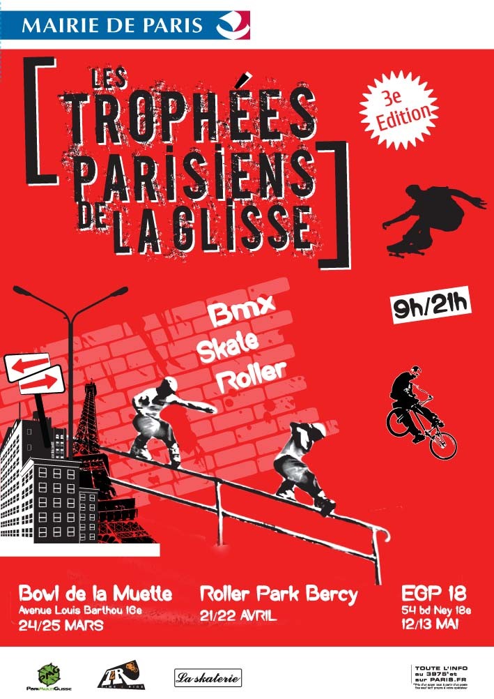 L'association Arollo, membre de l'OMS du 16ème, vous convie à la 3ème édition des Trophées parisiens de la glisse. Cette manifestation ouverte à tous aura lieu au stade de la Muette les 24 et 25 mars 2012.
