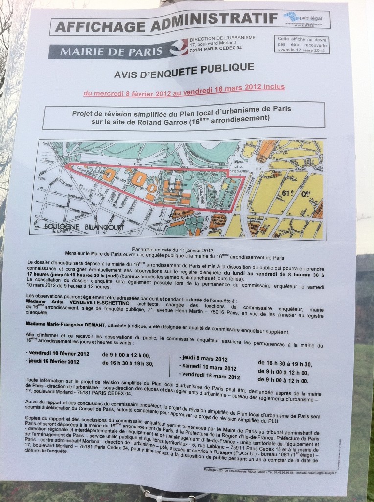 Même si elle n'est pas annoncée sur le site internet de la Mairie d'Arrondissement (contrairement à ça), où elle doit pourtant avoir lieu, une enquête publique vient de débuter dans le 16ème. On est malheureusement habitué dans le 16ème à ce type de dissimulation. Heureusement, le site de la Maire de Paris l'indique sur son site ainsi que par l'habituel affichage administratif aux environs.
