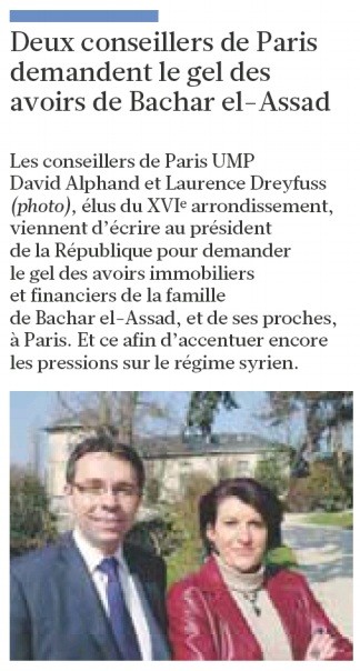 Initiative remarquée -voir remarquable- et révélée ce matin par le Figaro que celle de David Alphand et Laurence Dreyfuss, conseillers de Paris UMP, élus du 16ème et candidats dans la 14ème circonscription à l'élection législative de juin prochain. Le quotidien nous apprend, qu'ils viennent de demander au Président de la République de geler les avoirs français du dictateur Bachar el-Assad afin d'accentuer la pression sur celui-ci.