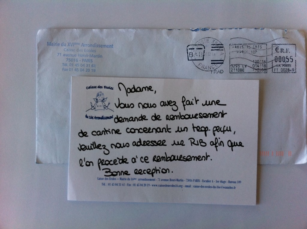 Nous apprenons de cette même maman que, malgré son courrier début janvier et la réponse positive qu'elle a reçue (cf. photo), la Caisse des écoles du 16ème tarde à rembourser les familles qui en ont fait la demande. Ainsi cette maman du 16ème, plus d'un mois après avoir envoyé, comme on le lui demandait, un RIB n'a malheureusement constaté aucun remboursement.