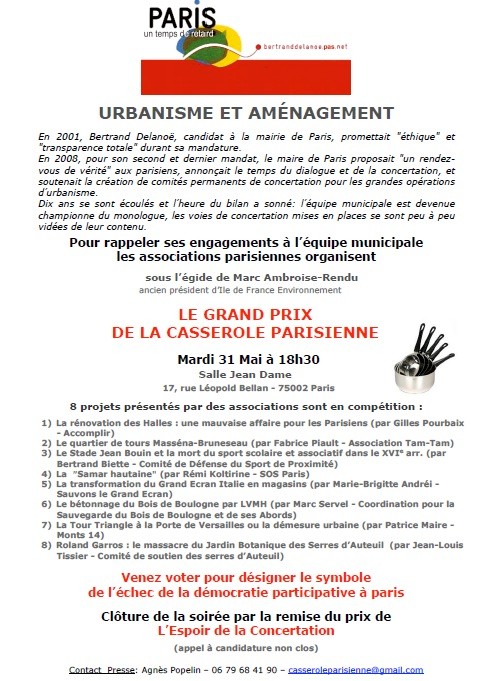 Le 16ème est particumièrement à l'honneur puisqu'il est nominé 3 fois sur 8, ce soir, pour le prix de la casserole. La présentation des diffèrents nominés commencera à 18h30, Salle Jean Dame, 17, rue Léopold Bellan dans le 2ème arrondissement, sous l’égide de Marc Ambroise-Rendu, ancien président d’Ile de France Environnement. Un vote parmi le public présent désignera le ou les vainqueurs.