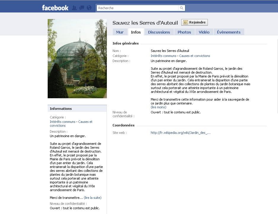 Une lectrice nous informe qu'un groupe sur facebook ce mobilise pour "Sauvez les serres d'Auteuil" et un autre nous signale une pétion en ligne sur le même sujet. L'exceptionnel et historique site serait menacé par le "projet d'agrandissement de Roland Garros, le jardin des Serres d'Auteuil".